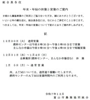 日頃から農協事業のご利用とご協力をいただき、誠にありがとうございます。年末年始の各店舗営業時間をご案内します。