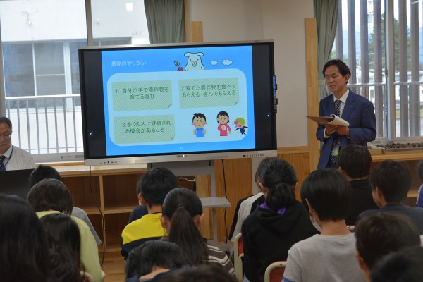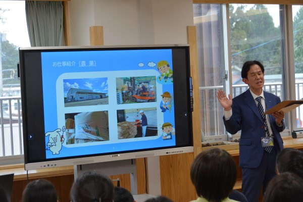同校より、小学生年代から将来の子供たちの職業の幅を広げたいとキャリア教育の依頼があり、JAのお仕事や農家の方の体験談を交えて授業をおこないました。