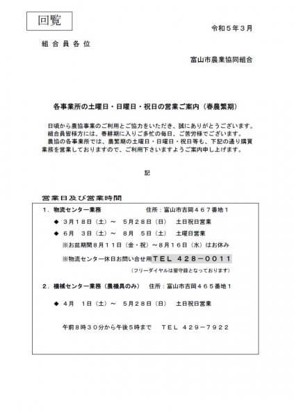 農繁期における休日営業のご案内