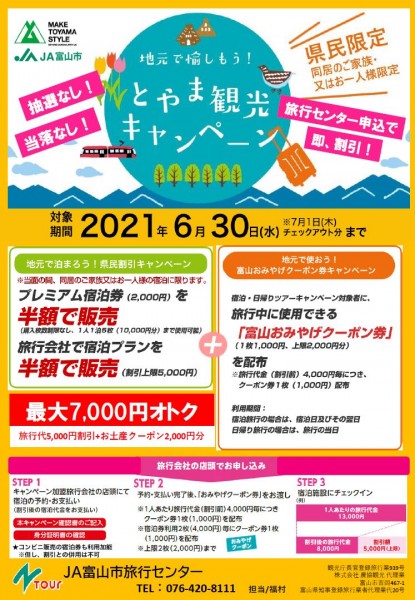 富山市農協旅行センターでは、現在富山県民を対象とした宿泊割キャンペーン「地元を愉しもう!」へ参加中です。