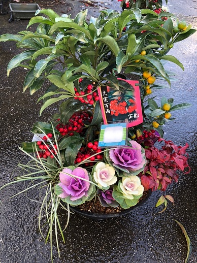 縁起物植物で正月を祝う逸品をつくり、「大実マンリョウは子宝」、