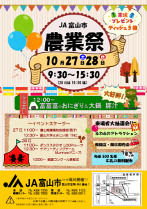 10月27日(土)のJA富山市農業祭にて予定しておりました富山大学よさこい部 TNC のステージは都合により中止となりました。楽しみにしておられた皆様には、ご迷惑おかけしますことお詫び申し上げます。