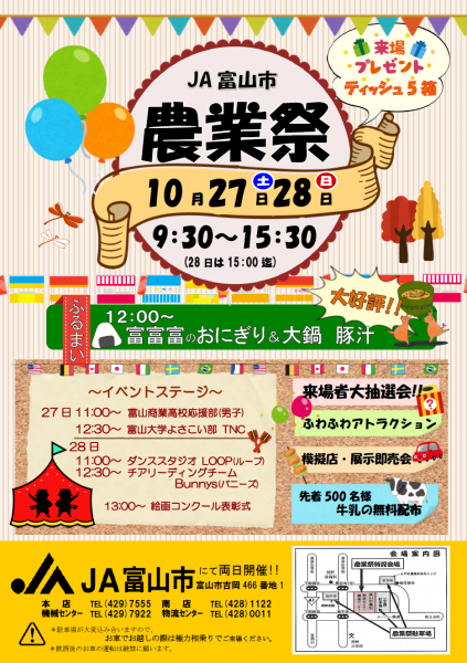 今年も、この時期がやってきました!JA富山市農業祭を10月27日(土)28日(日)の2日間開催します♪皆様のご来場をお待ちしております。